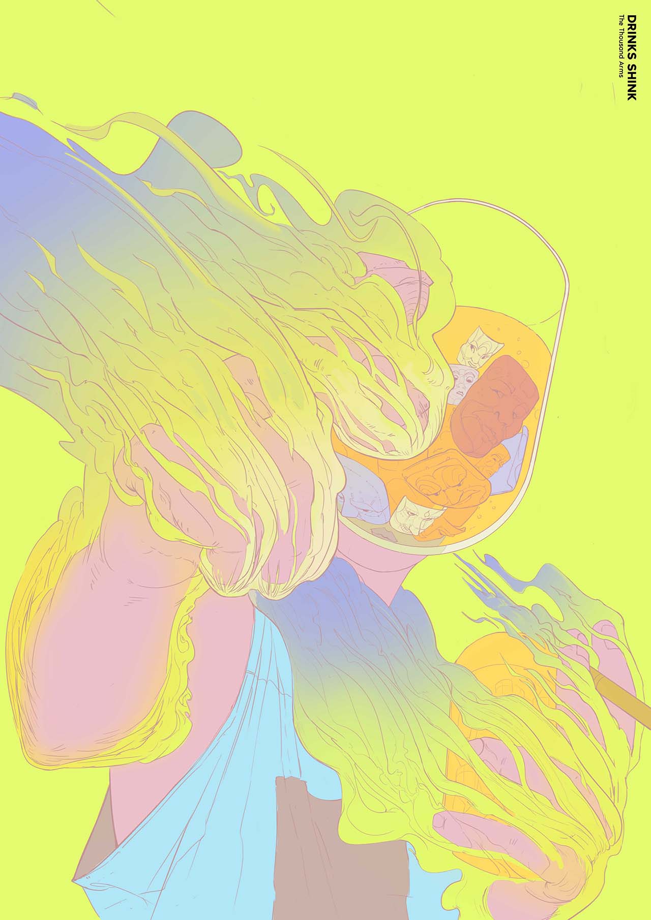 While there are other updates, Thousand Arms has been slow to progress, except that I have been working on the ‘Drink, Shrink!’ illustration. The line work looks interesting to me in style, but I need to print it to make sense of it. Also, have been trying out a different colour palette, though that is still a WIP.